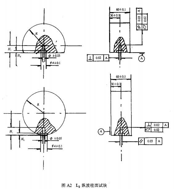 6.2.2.1 縱波探傷校準(zhǔn)標(biāo)準(zhǔn)靈敏度使用的L1、L2試塊見圖A1、圖A2。