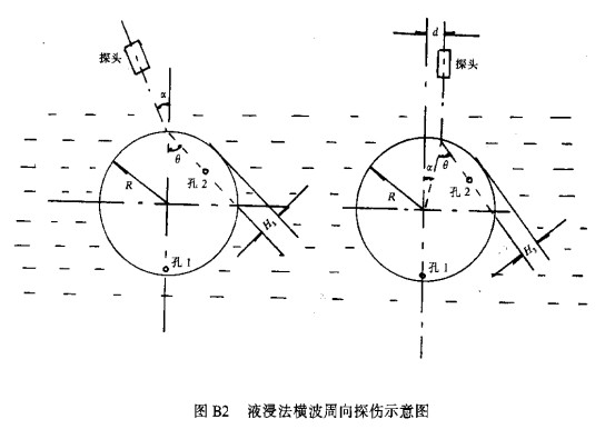 B1 采用T1、T2(或T3、T2)試塊校準(zhǔn)標(biāo)準(zhǔn)靈敏度時(shí),聲束人射角與折射角關(guān)系按公式B1計(jì)算。探傷示意圖見圖B1、圖B2。