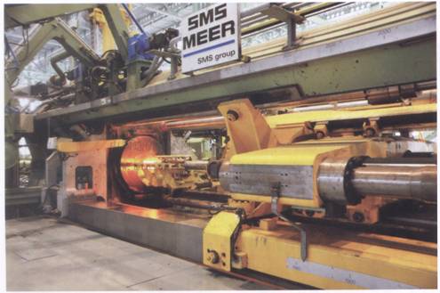 我國鈦及鈦合金擠壓生產(chǎn)開始于20世紀(jì)60年代末。當(dāng)時(shí),寶鈦公司和長城鋼廠分別從德國引進(jìn)了一臺(tái)3150噸可擠壓鈦合金的熱擠壓機(jī)。經(jīng)過近40年發(fā)展,寶鈦公司可擠壓鈦及鈦合金的各種規(guī)格的管、棒材及簡單斷面的型材及復(fù)合材,牌號(hào)達(dá)幾十種。這些產(chǎn)品已廣泛應(yīng)用于航空、航天、衛(wèi)星以及能源、化工等國民經(jīng)濟(jì)的各個(gè)部門。但是還應(yīng)該看到,我國與先進(jìn)國家相比,還存在較大差距,較復(fù)雜斷面的型材還不能生產(chǎn)。近幾年,隨著化工等民用領(lǐng)域?qū)Ω哔|(zhì)量鈦管需求劇增,西部鈦業(yè)、浙江五環(huán)等公司先后引進(jìn)了主要用于擠壓鈦管的擠壓機(jī)。2009年10月,寶鋼特鋼從德國引進(jìn)的世界先進(jìn)水平的6000T擠壓機(jī)投產(chǎn)(如圖3),為我國生產(chǎn)大規(guī)格鈦管和型材提供了必需的裝備,標(biāo)志著我國鈦材擠壓設(shè)備上了一個(gè)新臺(tái)階。