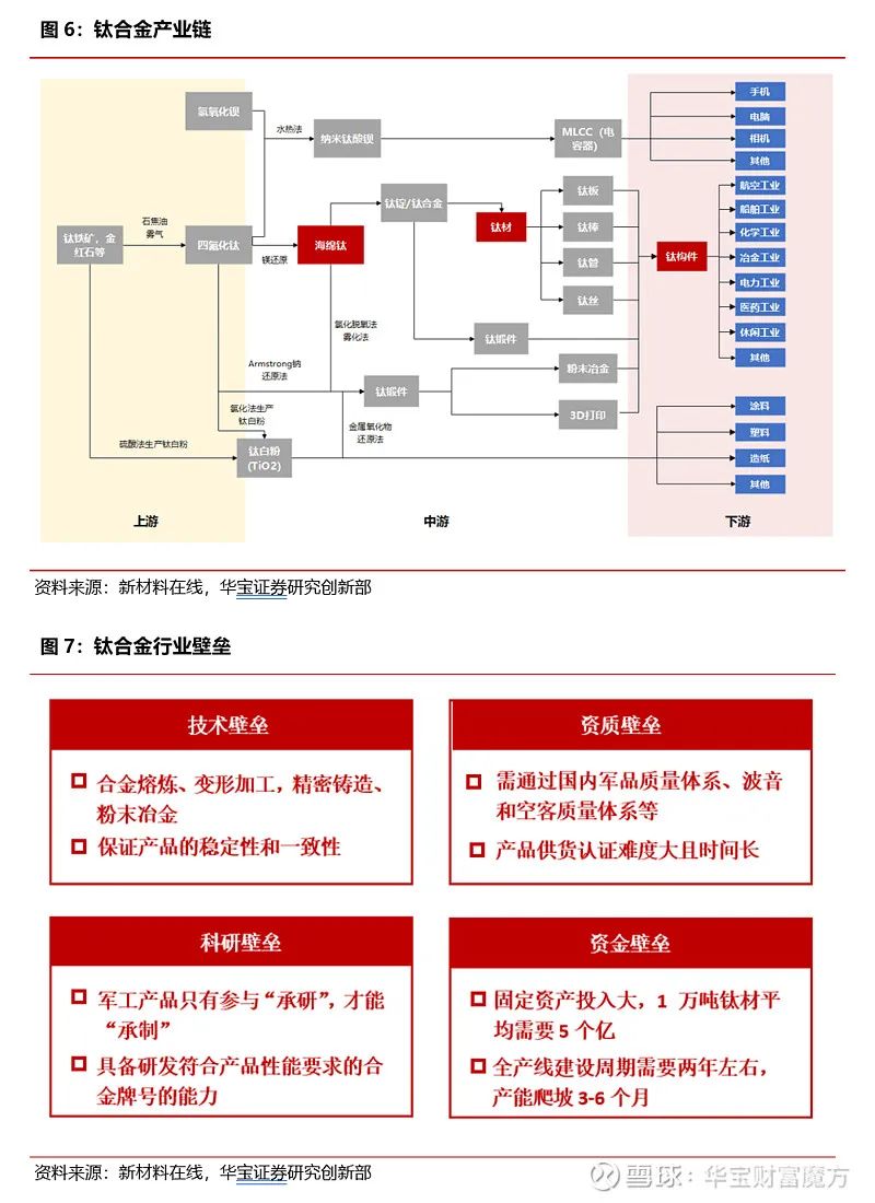 鈦合金的制備工藝較高溫合金簡單,難點(diǎn)集中在海綿鈦和鈦材的制備。鈦材產(chǎn)業(yè)鏈的核心壁壘不在于上游資源和中游冶煉,而是在于鈦材的加工能力,尤其是高端鈦材的研發(fā)能力和制造工藝。鈦合金加工壁壘高筑,導(dǎo)致綜合壁壘亦較高,催生近乎雙寡頭競爭格局。盡管原料金屬鈦價(jià)遠(yuǎn)低于鎳,但是基于鈦合金后端加工工藝復(fù)雜,最終部分鈦合金產(chǎn)品價(jià)格與高溫合金價(jià)格相當(dāng),甚至略高一籌。