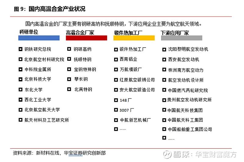 經(jīng)過50多年發(fā)展,我國已經(jīng)形成了比較先進(jìn),具有一定規(guī)模的生產(chǎn)基地。結(jié)合產(chǎn)業(yè)鏈各個(gè)環(huán)節(jié)相關(guān)參與方來看,目前我國生產(chǎn)廠商集中在航空航天領(lǐng)域用量最大的變形高溫合金冶煉和鍛造環(huán)節(jié),因此在大批量生產(chǎn)高溫合金母合金、板、棒、鍛材上有很大的優(yōu)勢。